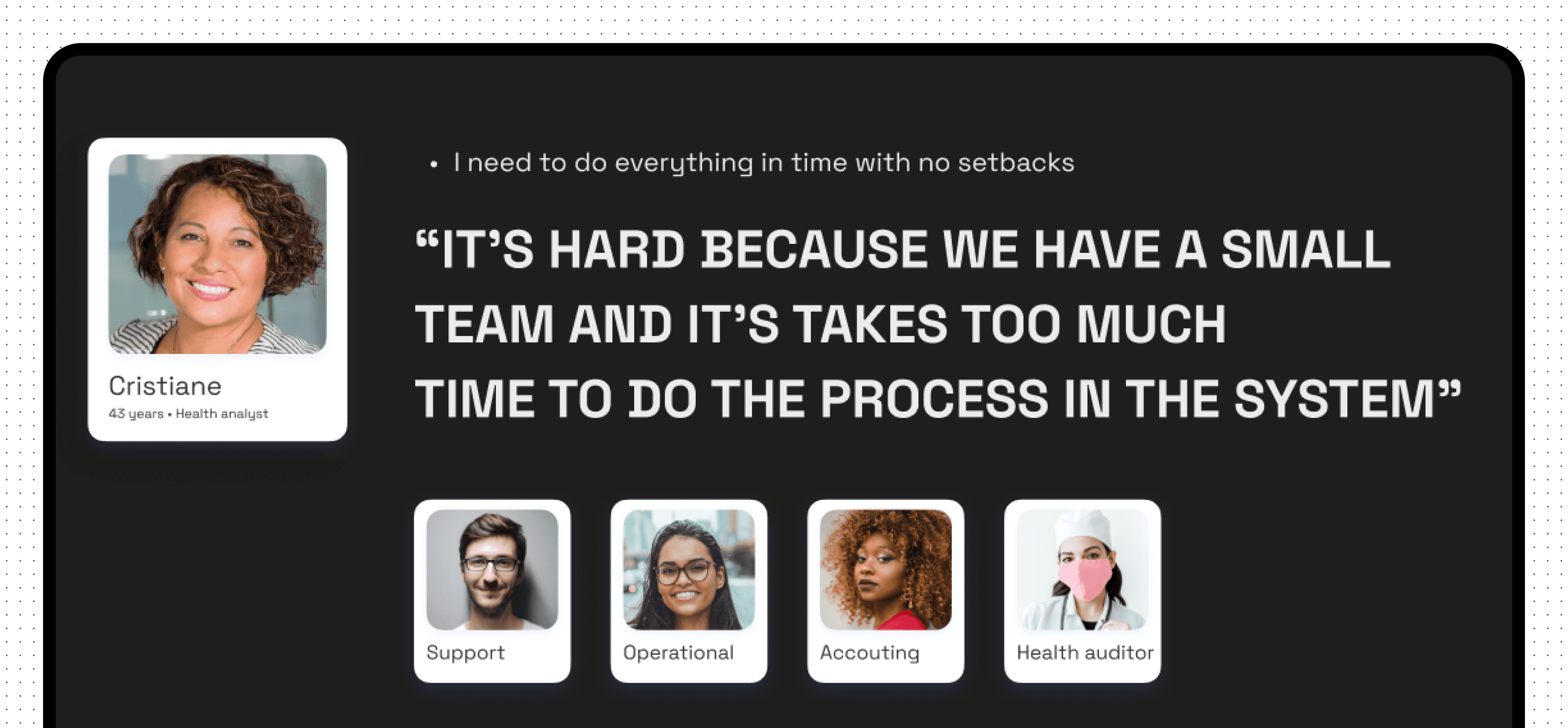 We started the project with a research stage, in order to better understand users and their needs, identify the main pain points in the current process and possible opportunities. With that in mind, and taking into account the geographic limitation, we created a research plan using quantitative and qualitative research, where we were be able to interview users from the 4 areas involved in the process and collect the necessary data.