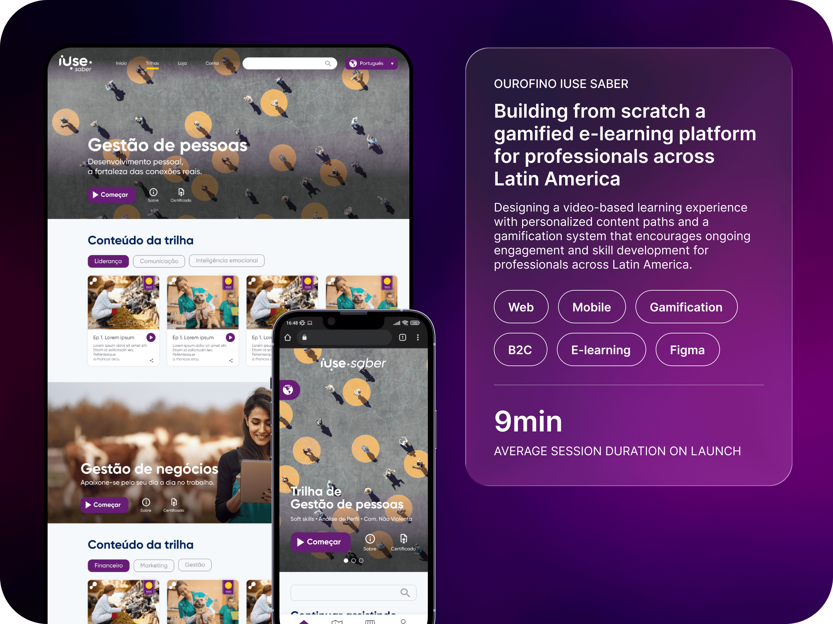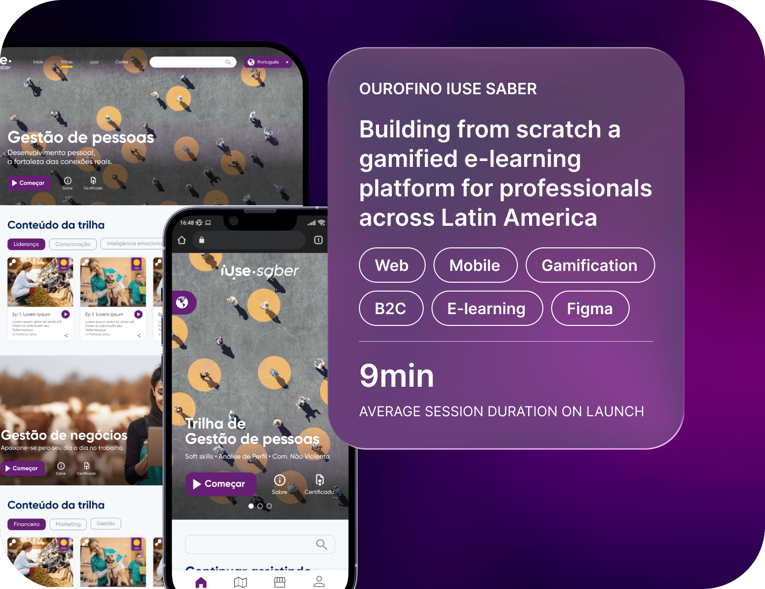 Ourofino set out to create a new mobile web learning platform, iUse Saber, to support personal and professional development for animal health professionals. The challenge was to design a customizable platform with knowledge trails, gamification, and virtual rewards, enabling users to access premium content for free. Without this solution, professionals would continue to face high costs and fragmented resources, limiting their growth and connection to the brand.