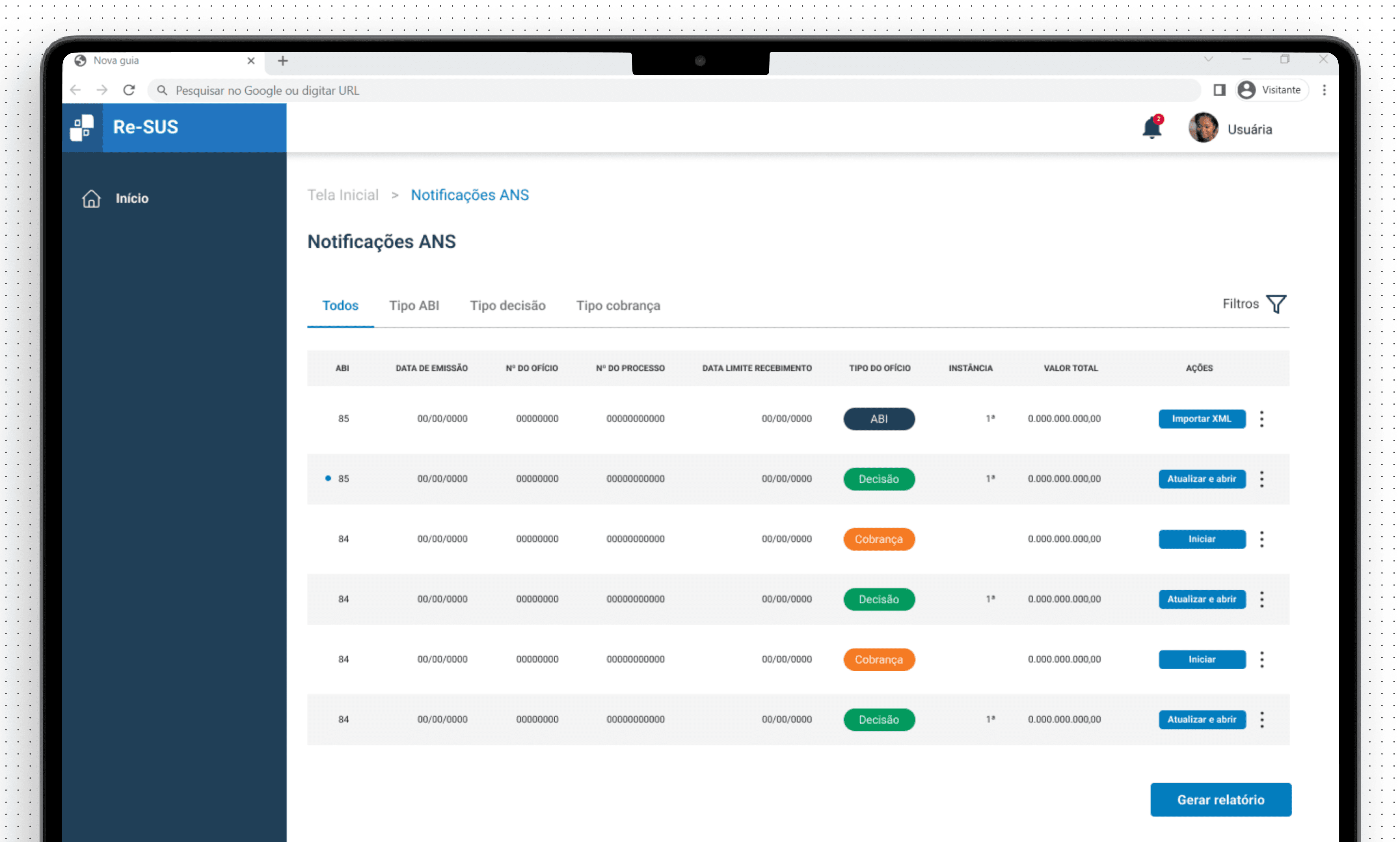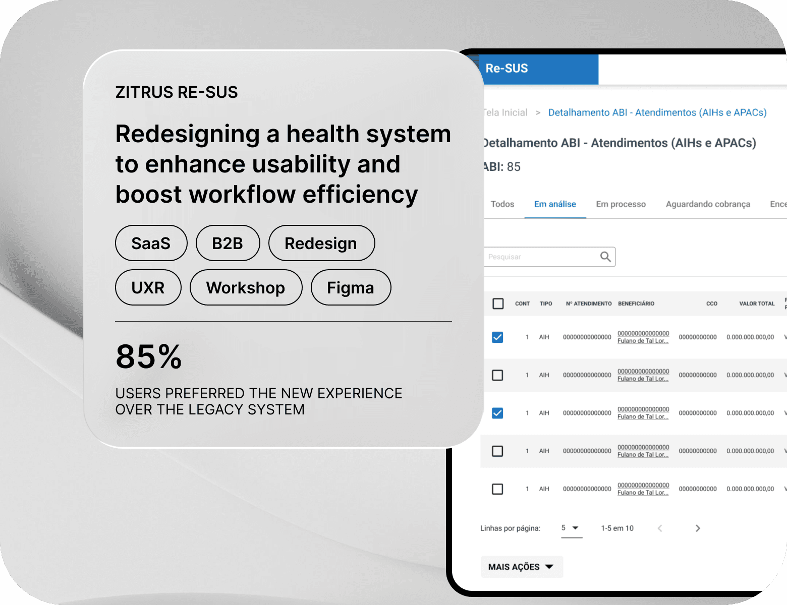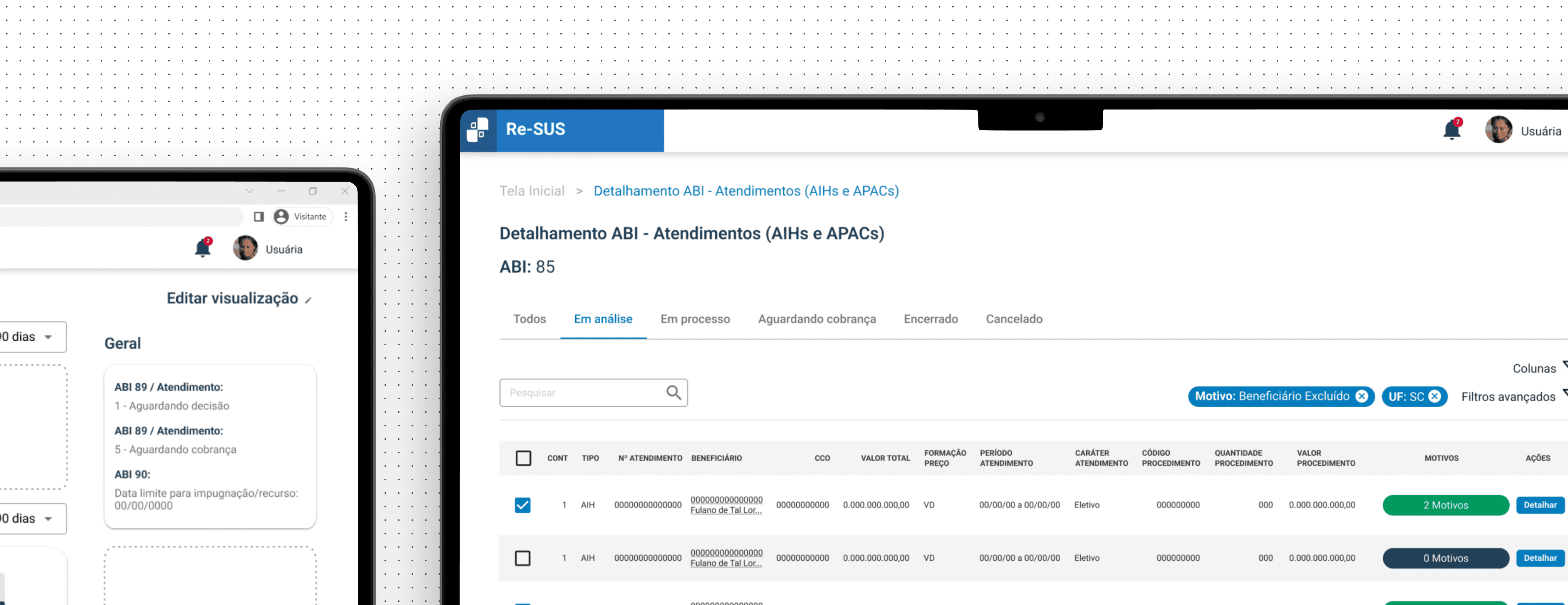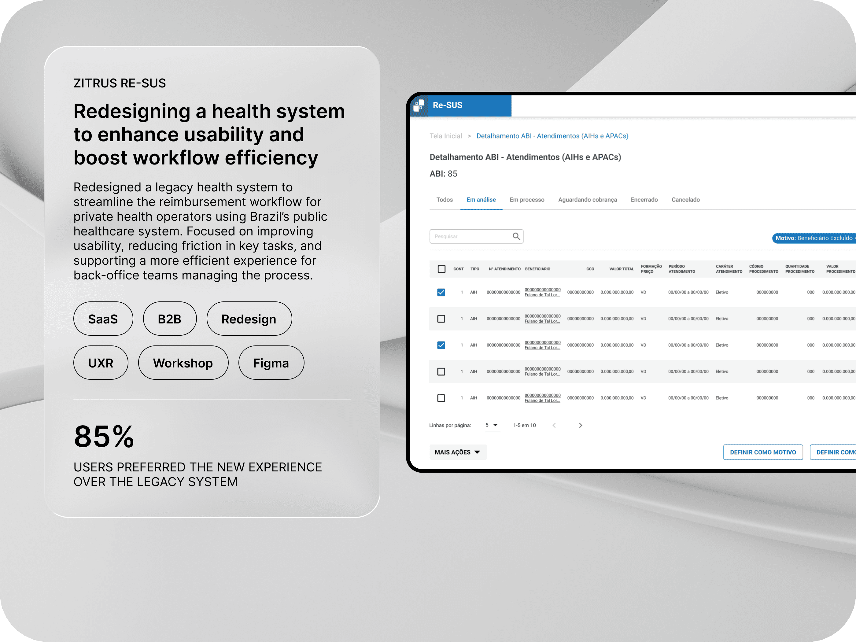 Re-SUS was created to be a management and control system for the refound process to SUS (Brazil's Unified Health System). This process occurs when a health plan beneficiary chooses to use SUS. The company was investing in updating all its products to better meet the needs of health plan operators and with that, my main challenge was the redesign of the application.